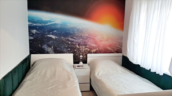 1 Schlafzimmer mit 2 Einzelbetten. 1 Router für WiFi und Internet.